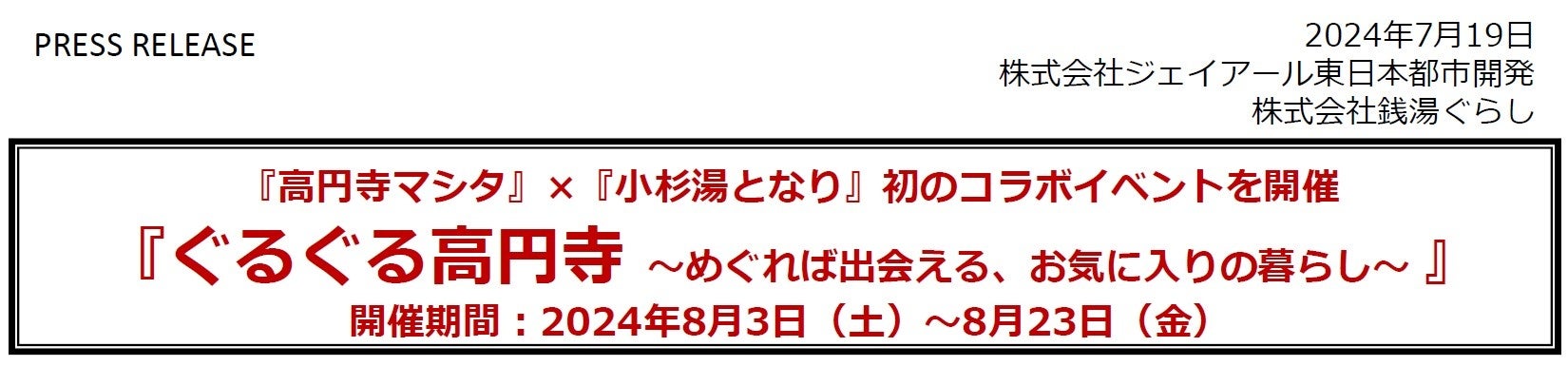 共に高円寺に拠点を置き、鉄道高架下・銭湯という異なる切り口からまちづくり・くらしづくりに取り組む「高円寺マシタ」(運営:株式会社ジェイアール東日本都市開発)と「小杉湯となり」(運営:株式会社銭湯ぐらし)。この2つの施設が「高円寺のまちの暮らしを楽しむ」をコンセプトに初のコラボイベントを開催いたします。