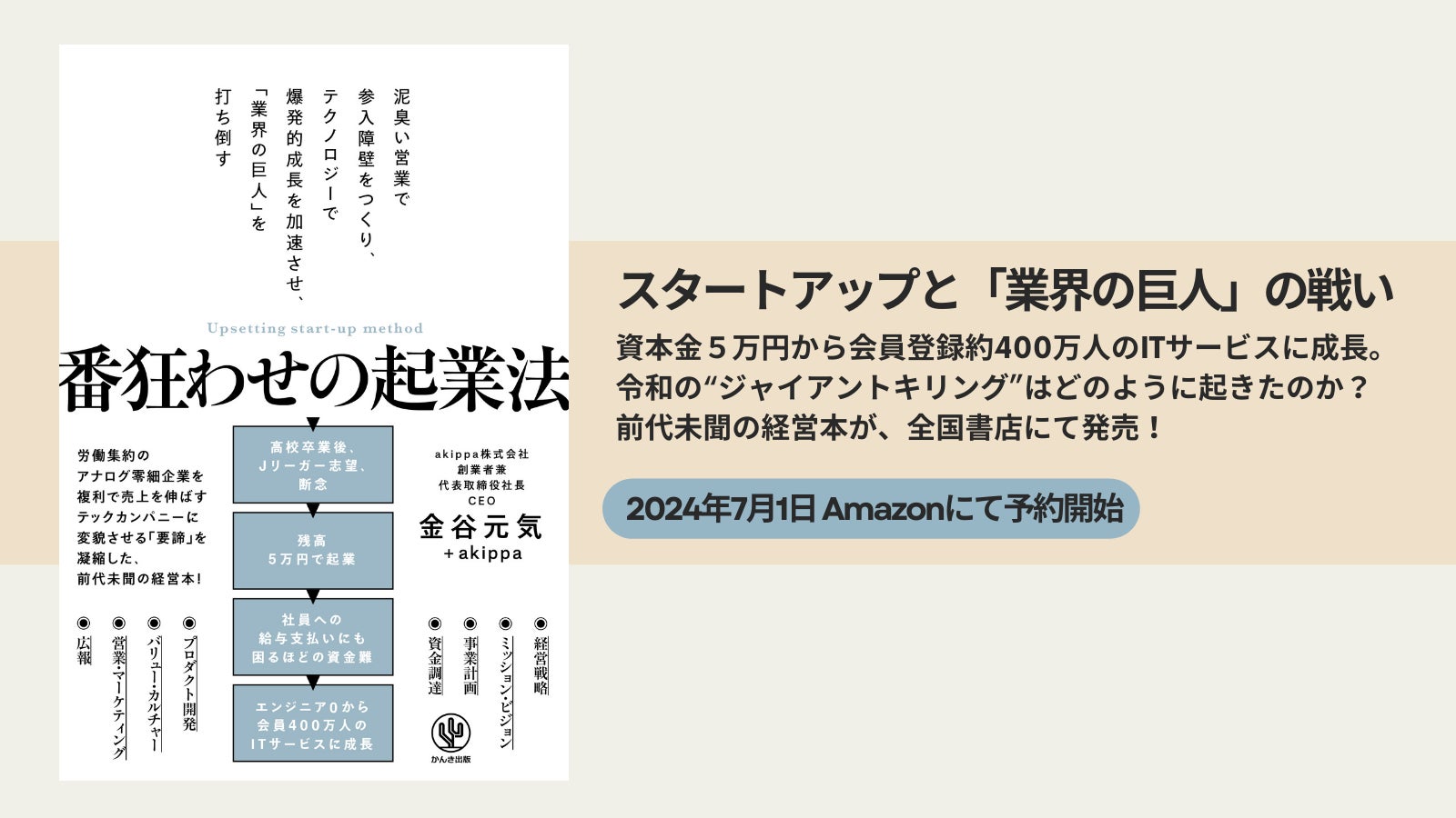 駐車場シェアリングサービス「アキッパ(akippa)」(以下、アキッパ)を運営するakippa株式会社(代表取締役社長 CEO:金谷元気) は、著書『番狂わせの起業法』(著:金谷元気、akippa)をかんき出版より発売いたします。本日2024年7月1日(月)よりAmazonにて予約販売を開始しました。2024年7月31日(水)より全国の書店にて発売予定です。