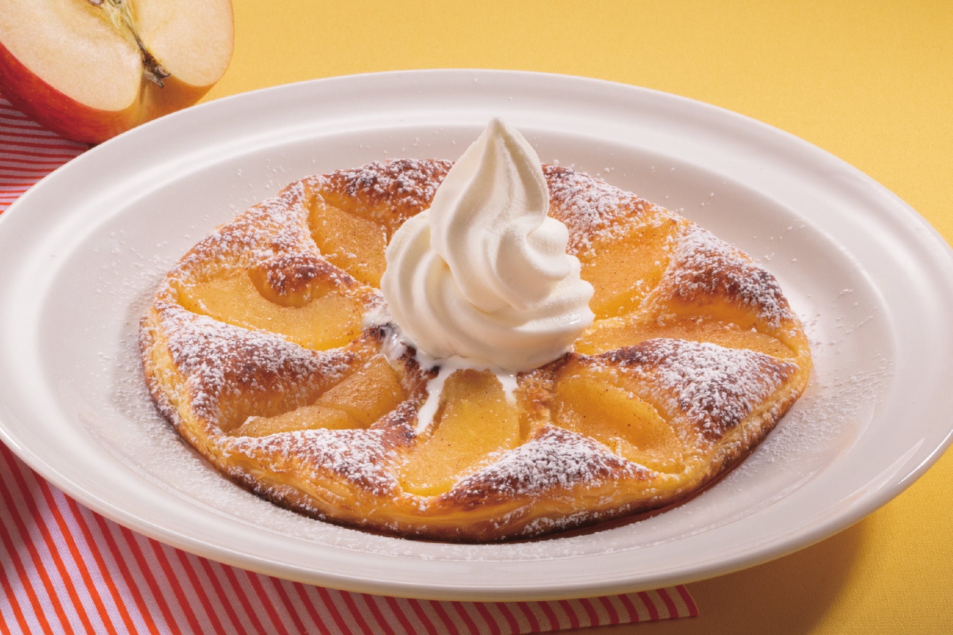 シナモン風味の甘く煮詰めたりんごをトッピングし、オーダーが入ってから焼き上げるパイです。パイのサクッ!とした食感は焼きたてでしか味わえない美味しさです。りんごやソフトクリームとご一緒お召し上がりください。