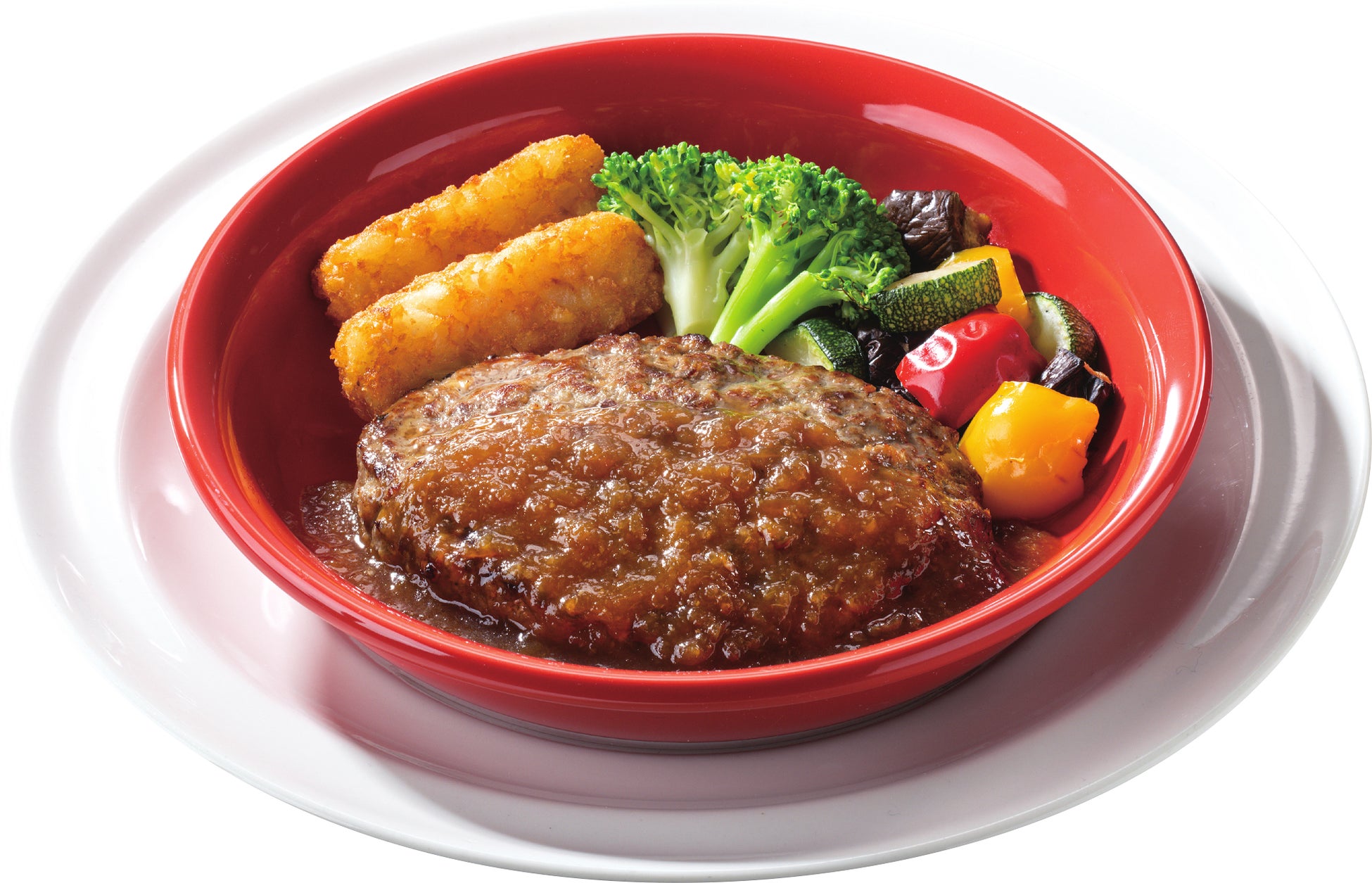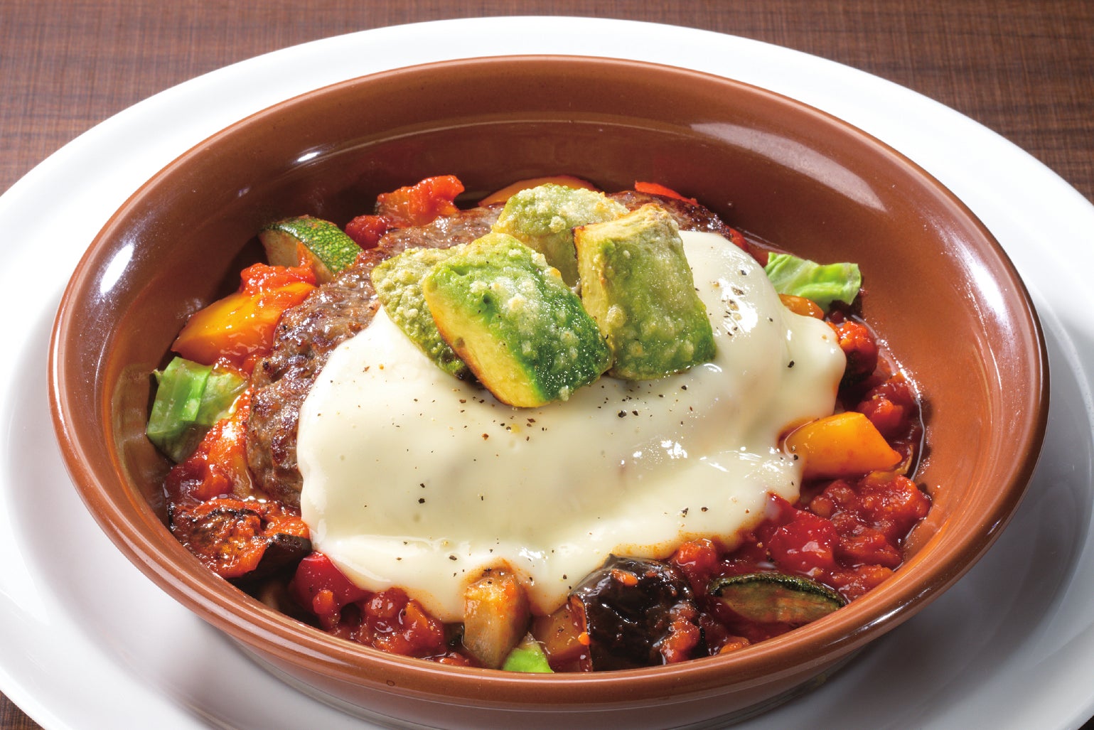 ビーフ100%粗挽きステーキハンバーグにパプリカ・ナス・ズッキーニ・キャベツと、たっぷりのトマトを使ったガーリックソース、自家製ホワイトソースとチーズソースを合わせました。