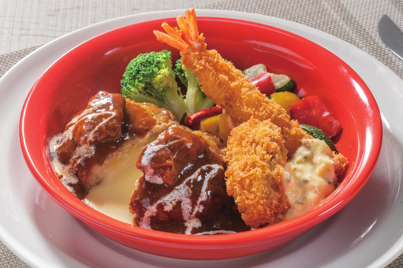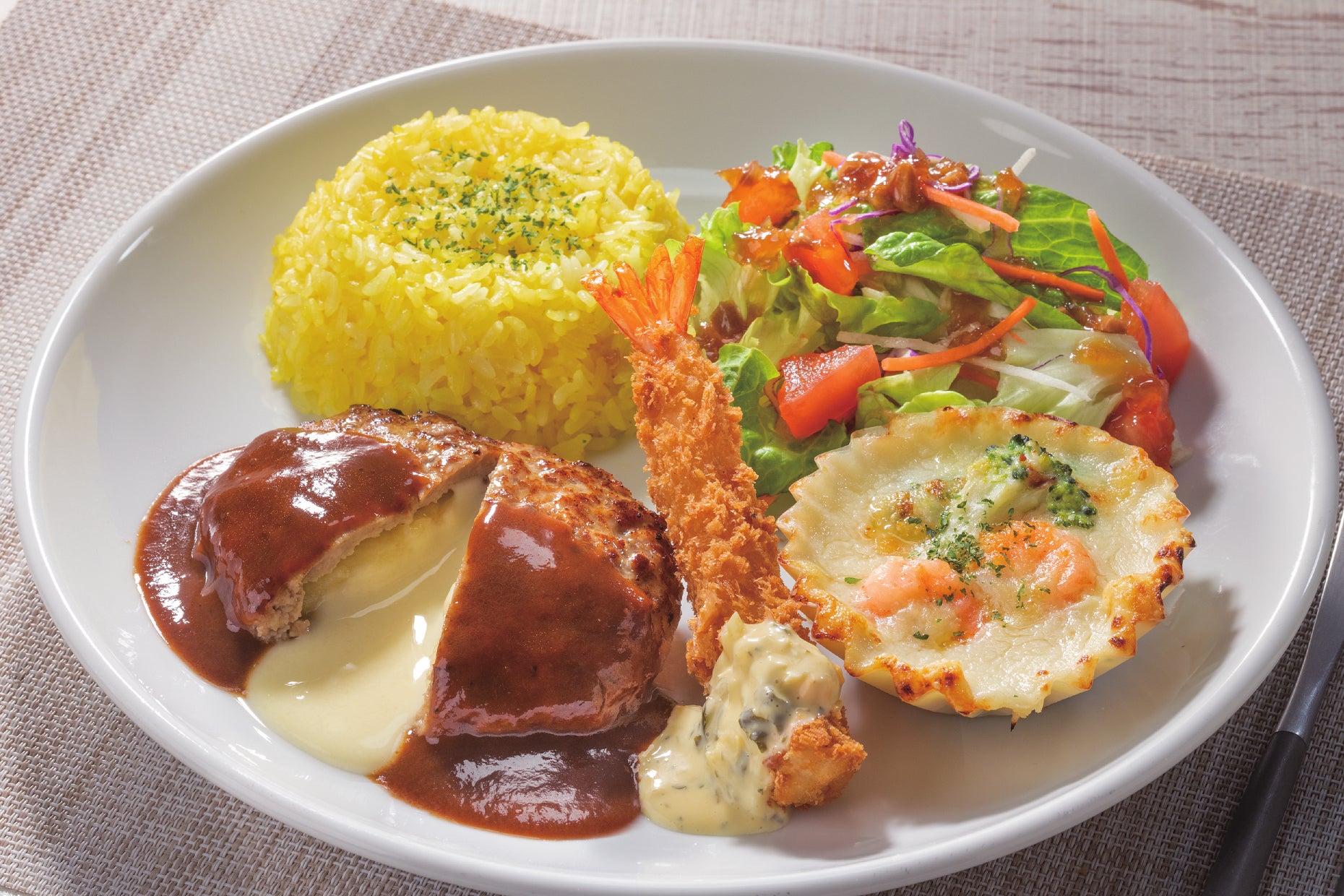 他にも、ピラフ・海老グラタン・海老フライ・サラダ等、みんなが好きなメニューを一皿にした満足感たっぷりのプレートです。