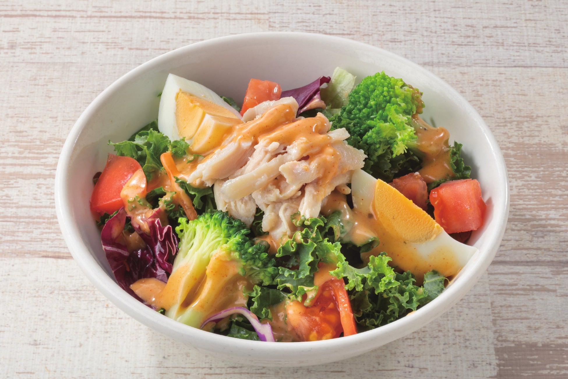 ケールは、土耕、水耕両方あり地域や時期によって味や食感が異なるので、そこも楽しんでいただけるサラダにリニューアルいたしました。