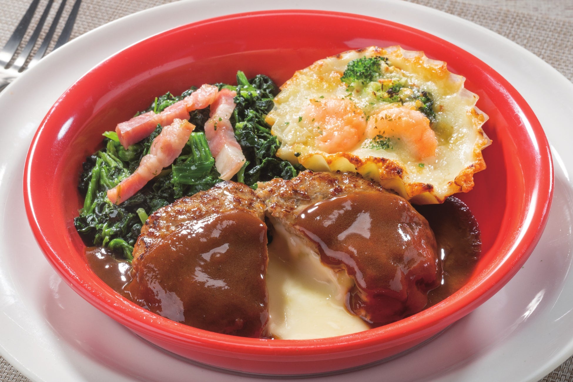 理想の味わいを実現したチーズINハンバーグのミニサイズに、ルーから丁寧に作った自家製ホワイトソースとチーズと小海老・ブロッコリーを乗せて焼き上げたグラタンのセットです。