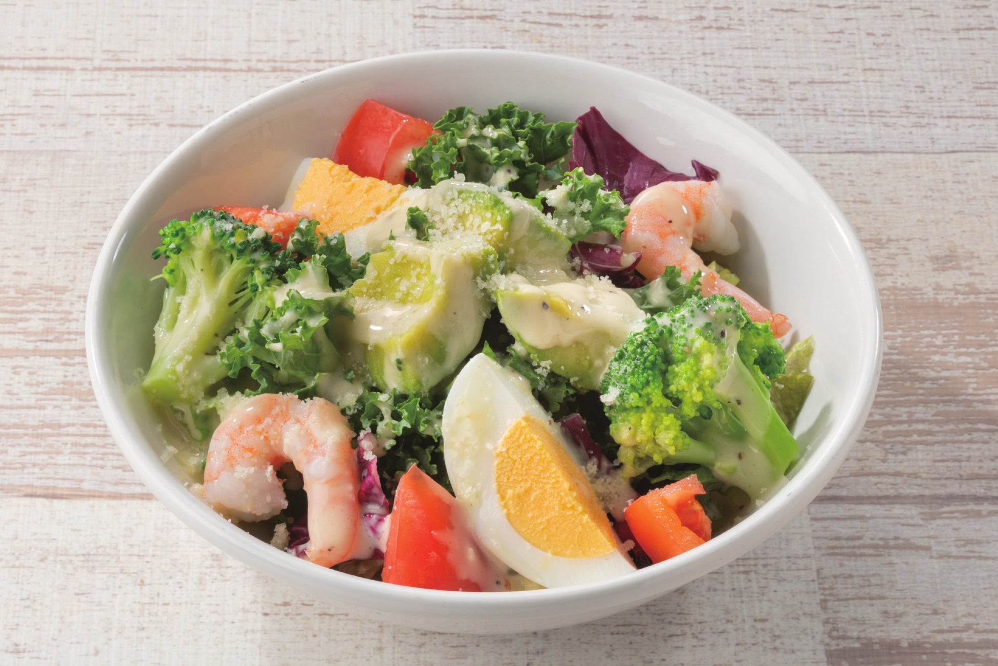 野菜の王様と呼ばれ、βカロテンがたっぷりで栄養価の高いケールは、日本各地の農家さんに作っていただき1年を通して安定して供給可能な国産を使用しました。8種類の野菜サラダに、たんぱく質が豊富な海老にアボカド等を加えた、ボリュームのあるサラダです。