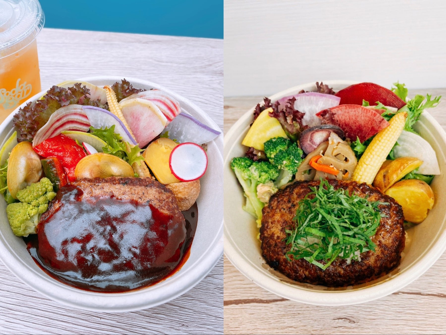 Bセット(右) しそとおろしのさっぱり和風ハンバーグボウル+オリジナルソーダ 1,200円(税込)