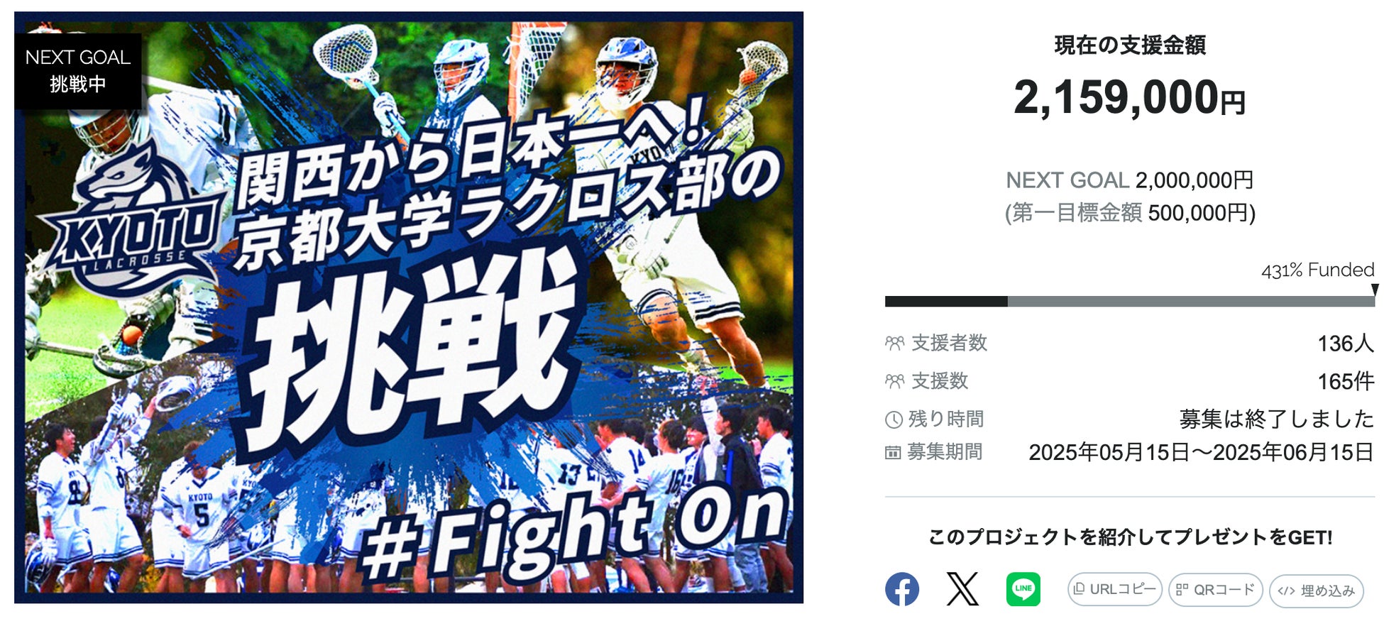 先日実施した京都大学男子ラクロス部のクラウドファンディングでは、多くのご支援をいただき最終Goalとして設定した200万円まで達成し、その後も多くのご支援をいただき終了いたしました。