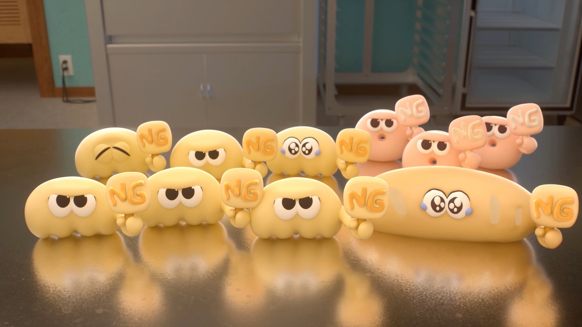 まさかパン、しかも赤ちゃんのパンをキャラクターデザインするなんて、もちろん初めてのことでした。服も着ていなければ手足も生えていない(ときが多い)まっさらなパン生地を、皆に愛してもらえるベイビーにするために、細かな試行錯誤がありました。「こっちの方がパンらしい目をしている」「このパンはこんな風に走るはずだ」と、姿や仕草を描き進めるうちに、パンの親心のようなものが芽生えた気がします。そして、無事に焼きあがった映像を見て感無量です!赤ちゃんたちの勇姿を、お楽しみください!