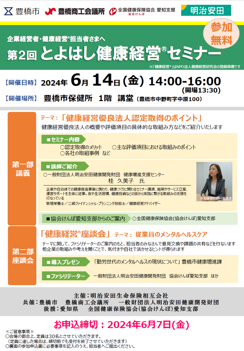 愛知県豊橋市は、企業経営者や健康経営担当者向けに6月14日(金)に「第2回とよはし健康経営セミナー」を開催し、健康経営の更なる推進を目指します。