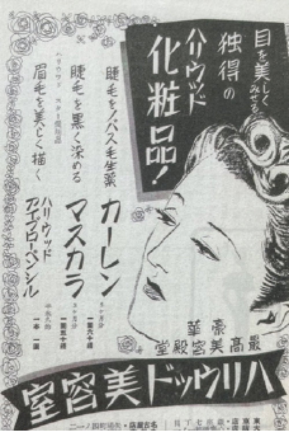 ここに昭和15年(1940年)の年の広告が残っている。「けはえ薬」として研究をはじめ。社会に広めはじめたハリウッドの原点の一つである。すでに大正14年に銀座に美容室をはじめてから髪の毛のプロとしてのビジネスで急成長してきたハリウッド。新しく化粧品として育毛の研究が商品という形になった。戦前から育毛剤をつくっているのは日本でもハリウッド含めごくわずかだった。