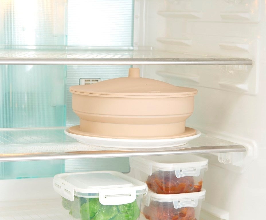 この商品は、直径約21cm / 底面部直径約17cmで、深さもあり食材がたくさん入るのに、フタを裏返して重ねると約5㎝の薄さに早変わり。引き出しのすき間や鍋の横にもスッと収納できてストレスフリーなシリコンスチーマー。