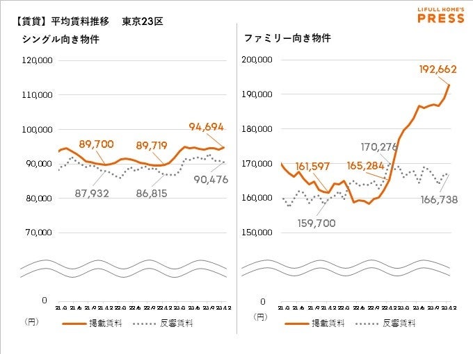 一方で、ファミリー向き賃貸物件の掲載賃料は19万2,662円(12月時点)で前年比116.6%と、金額にして前年から2万7,379円もの大幅アップとなりました。これは、前述の売買物件価格の高騰を背景にファミリー層の賃貸需要が高まっていることや、昨今の消費者物価の上昇を受けて契約更新時に賃料の値上げを実施するケースが増えていることが背景にあると考えられます。