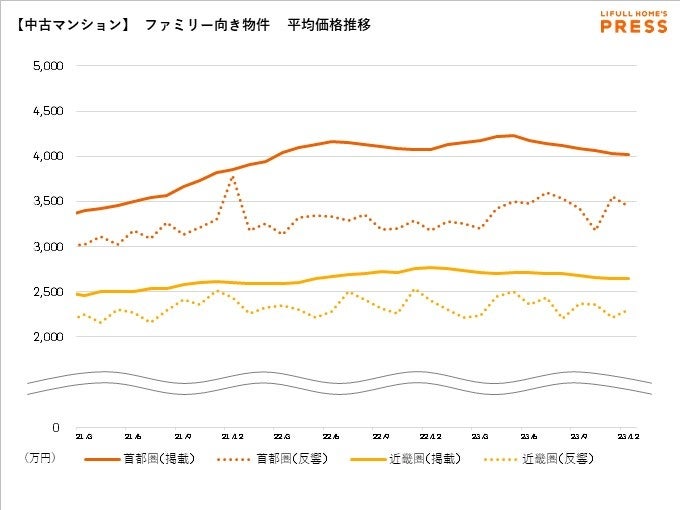 2023年10~12月期のファミリー向き中古マンションの掲載平均価格は、首都圏、近畿圏ともやや下落基調で推移している一方で、東京23区に限ると横ばい傾向が継続。東京都心6区(※1)では直近約1年間にわたって上昇基調が続いています。23区では一部の高級物件の影響があるものの、2023年11月には新築マンションの平均価格が1億円を超えるなど価格の上昇が続いている一方で、その供給数は減少傾向にあります。これにより中古市場では新築マンションを買えなかった人の代替需要が生じているほか、円安を背景とした海外からの投資需要も活発化しており、都心を中心に中古マンション価格の上昇が継続していると思われます。