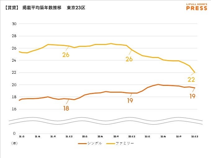 また、東京23区ではファミリー向け賃貸物件の掲載平均築年数が前期に引き続き大きく減少しました。そもそも東京都では賃貸物件の新築供給数が増加(※3)しており、なかでも特にファミリー向き物件の新築供給数が増加(※4)しています。もまたこの傾向は、前述のファミリー向け賃貸物件の掲載賃料上昇の一因になっていると考えられます。