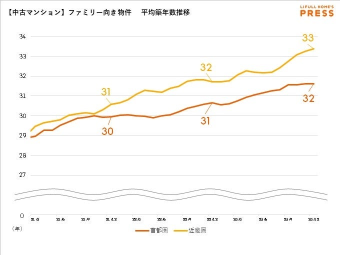 また、首都圏・近畿圏とも掲載平均築年数の上昇傾向が継続しています。これは、近年新築マンションの供給が漸減しているほか、売り出し物件の平均築年数と成約物件の平均築年数の乖離も拡大(※2)しており、築年数の経過した物件ほど在庫として市場に残っていることが一因と考えられます。