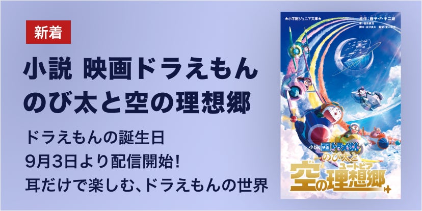小学生~中学生を対象にした、小学館の児童文庫レーベル『小学館ジュニア文庫』。この度、『小学館ジュニア文庫』より刊行されている 「小説 映画ドラえもん」シリーズのオーディオブック化が決定。 オーディオブックとは、本を目で読むのではなく、耳で聴いて読む、新感覚の読書体験です。シリーズのオーディオブック第1弾として、『小説 映画ドラえもん のび太と空の理想郷(ユートピア)』が2024年9月3日より配信スタートしました。配信後、約1か月が過ぎ、多くのお客様にお楽しみいただいており、「オーディオブック9月人気ランキング」では6位を獲得しています。