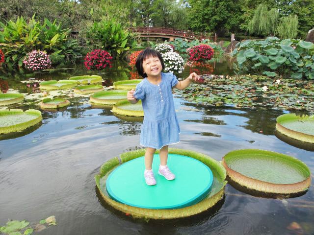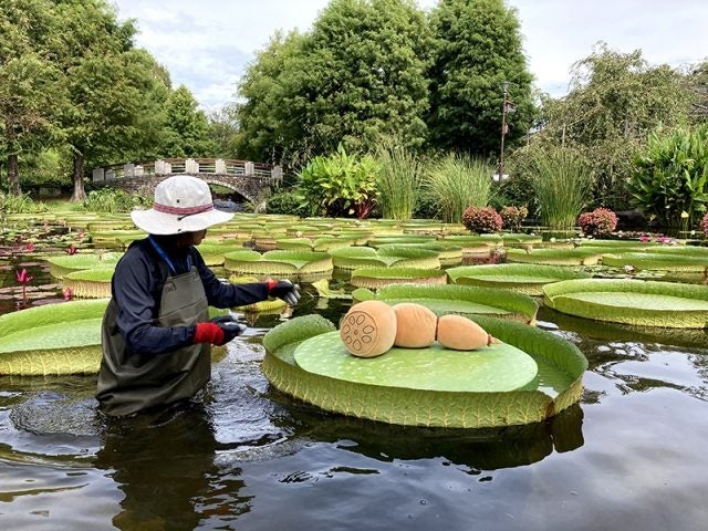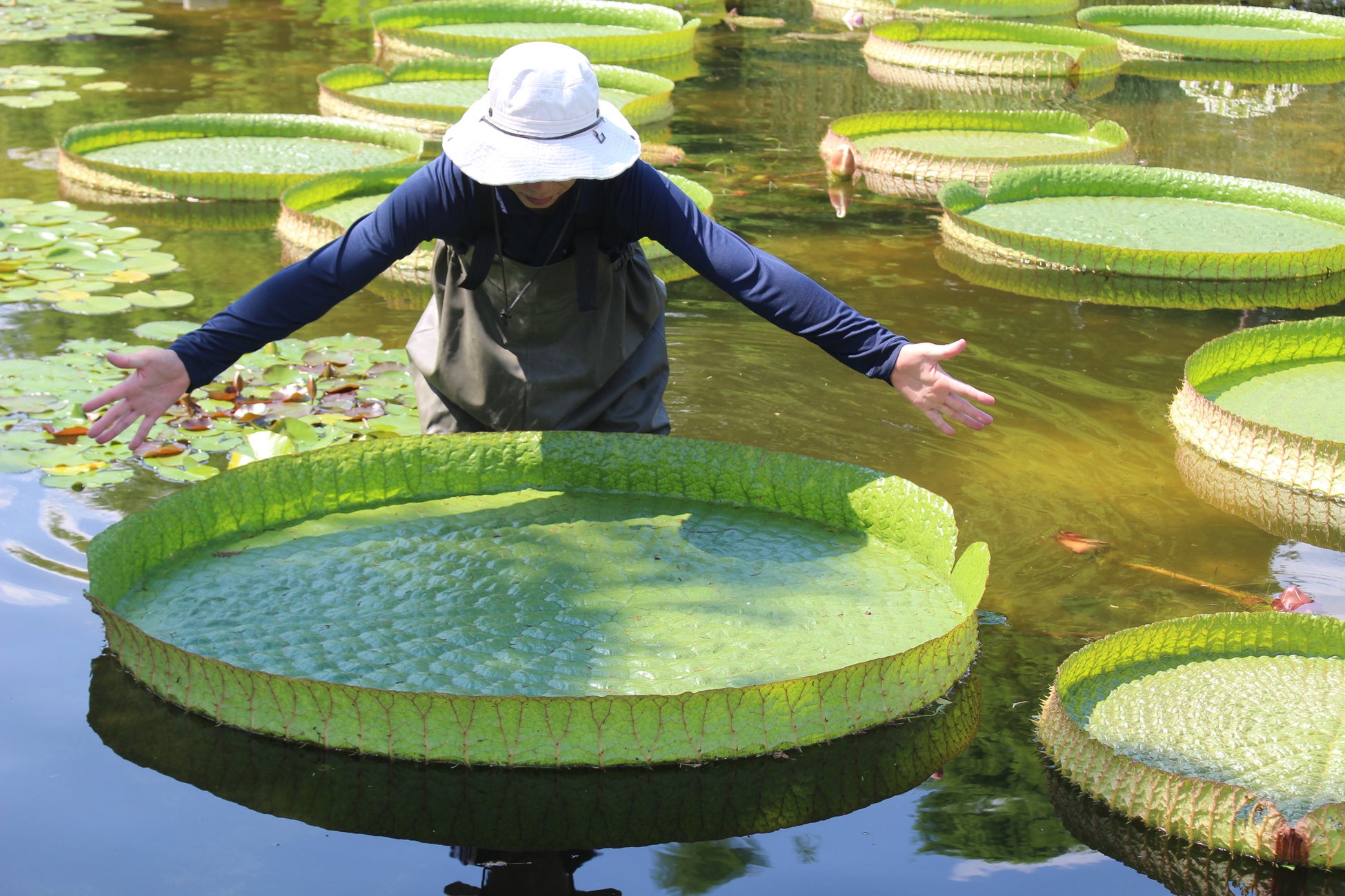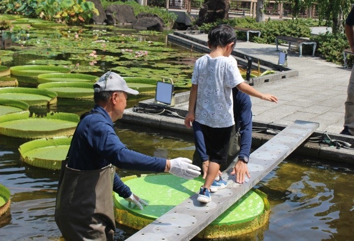 葉の大きさが最大1メートル~1.5メートルにもなる巨大な水草に乗ることができます。植物の不思議を体験することができる夏の人気イベントです。