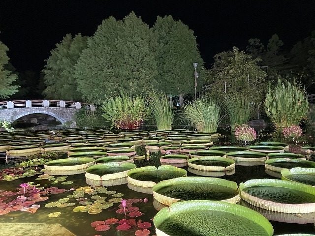 パラグアイオニバスの葉にぬいぐるみを乗せて写真撮影ができる”ぬい撮り”企画や、夜間の特別開園&ライトアップも実施