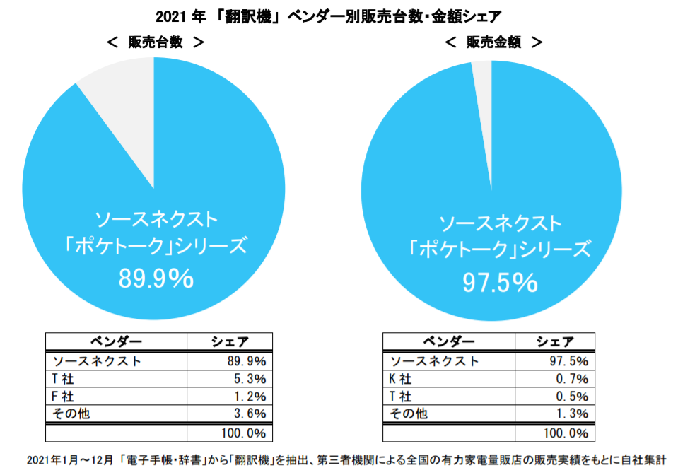 ソースネクスト株式会社(本社:東京都港区東新橋1-5-2 汐留シティセンター33階 代表取締役社長:小嶋 智彰)は、弊社のAI通訳機「POCKETALK®(ポケトーク)」シリーズの2021年12月の翻訳機市場でのシェアが、販売台数で92.2%(対前月比1.2ポイント減)、販売金額で97.0%(対前月比、1.3ポイント減)となったことをお知らせいたします。いずれも2017年12月の初代モデルの販売開始から49カ月連続で第1位を獲得しています。なお、同市場の2021年年間販売台数シェアでは89.9%、販売金額シェアでは97.5%ととなり、年間第1位を獲得いたしました。
