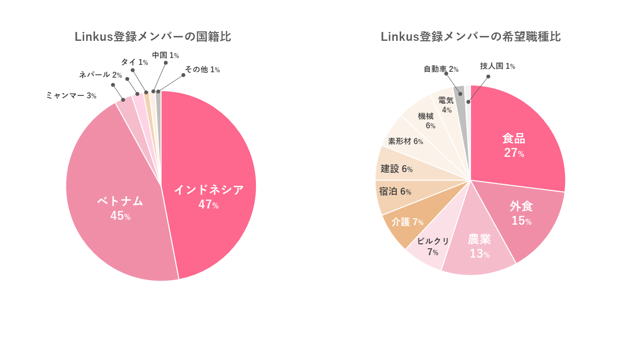 Linkus登録メンバーのうち主要な国籍はインドネシアが47%、ベトナムが45%を占めています。今後、入国の本格化によりインドネシア、ベトナム以外の国の割合も増えることが予想されます。職種で希望が多いのは食品製造27%、外食産業15%が大きな割合を占めています。