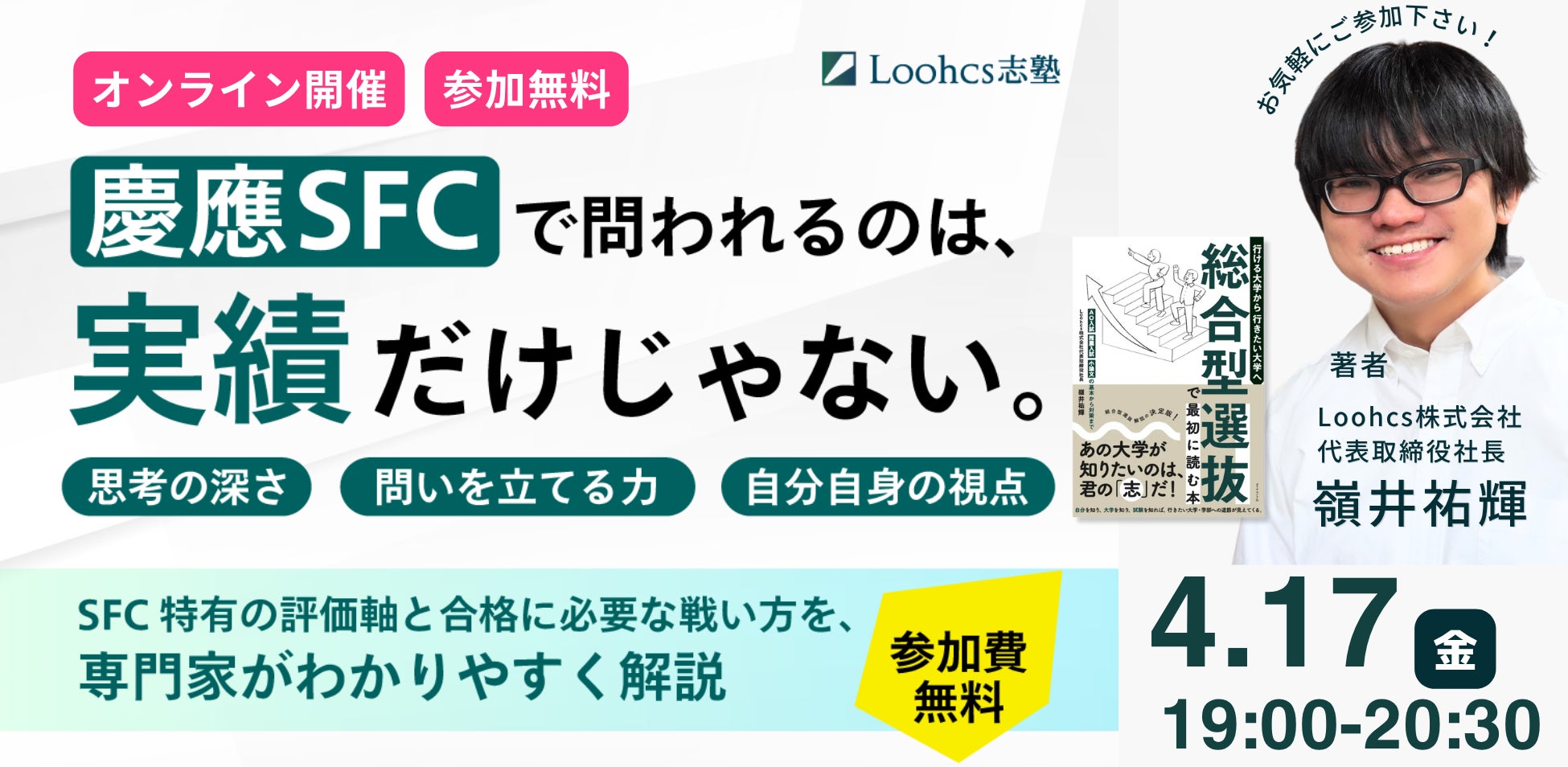 総合型選抜専門塾を運営するLoohcs株式会社は、慶應義塾大学の湘南藤沢キャンパス(SFC)の総合型選抜(旧AO入試)をテーマにした無料オンラインイベント「慶應SFC・総合型選抜のすべて」を、2026年4月17日(金)19:00より開催します。