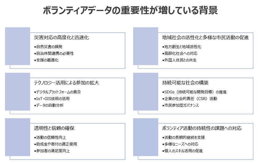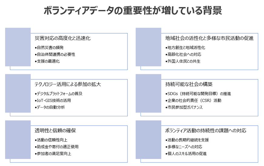 近年、社会課題の多様化や地域社会の変化に伴い、ボランティア活動の重要性がますます高まっています。特に、災害支援、高齢者福祉、多文化共生など、さまざまな分野でデータに基づいた意思決定が求められるようになっています。データの活用は、ボランティア活動を効率化し、持続可能な社会の構築を支える鍵となります。