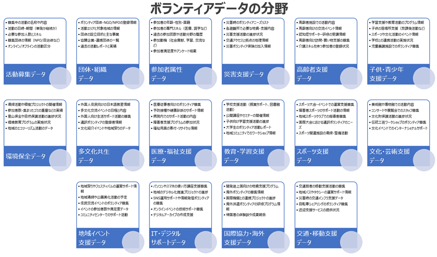 - 個人のスキル活用の促進:医療、IT、語学など、専門スキルを活かしたボランティア活動が求められており、スキル情報のデータ公開が役立ちます。