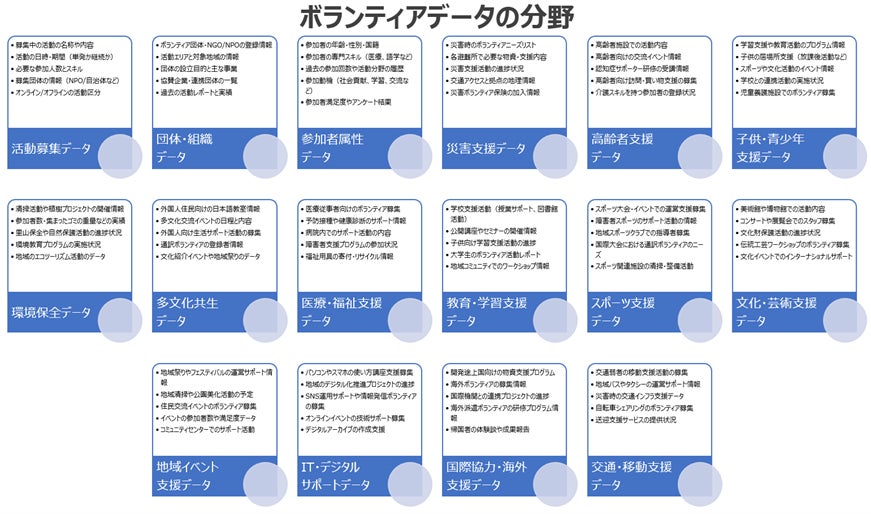 - 災害支援、福祉、教育、環境保全など、幅広い活動分野にわたるデータが提供され、多様な社会課題に対応します。