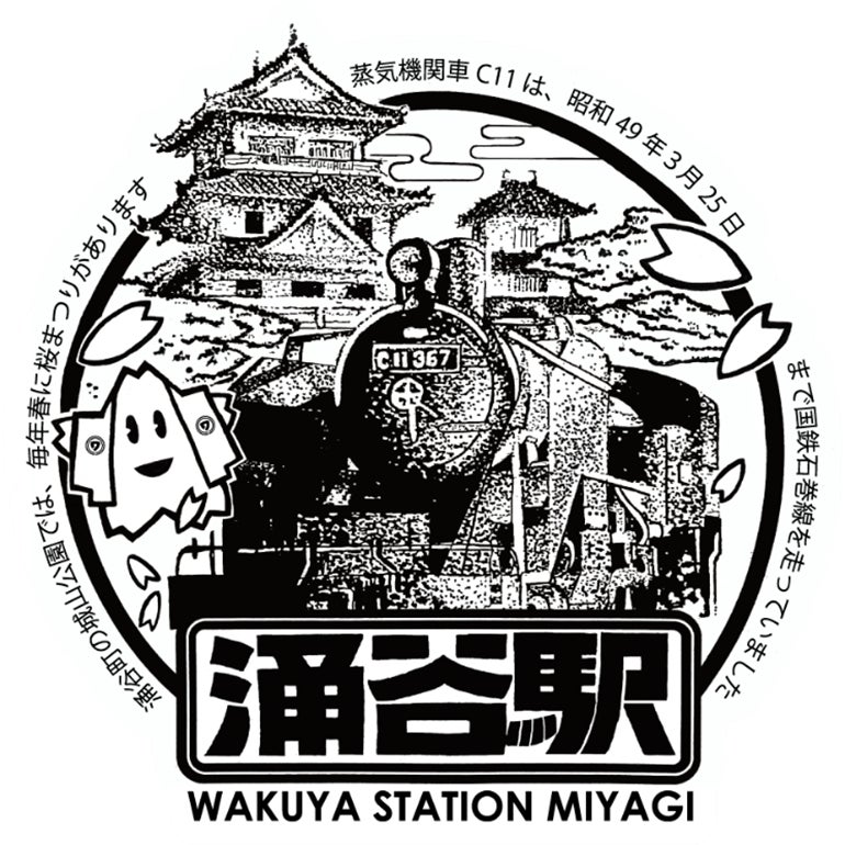 昭和49年3月25日まで国鉄石巻線を運行していた「SL11」を中心に、昭和31年頃の涌谷駅舎看板、桜が有名な城山公園と満開の桜、涌谷町公式観光PRキャラクター「城山の金さん」をモチーフとして配置し、涌谷町の歴史と魅力が伝わるスタンプデザインとなっています。