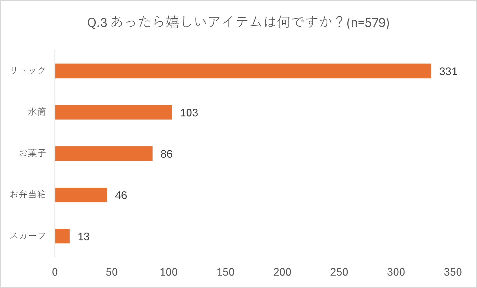 あったら嬉しいアイテムとして「リュック」が第1位(57.2%)と多くの方に選択いただきました。お出かけに行った際に、撥水加工の機能性や便利なポケットが充実した収納力に興味を持っていただいたことが伺えます。第2位では「水筒(17.8%)」、手を汚さずに片手で食べられる、紅葉のお供として意外にも「お菓子(14.9%)」が第3位の結果となりました。