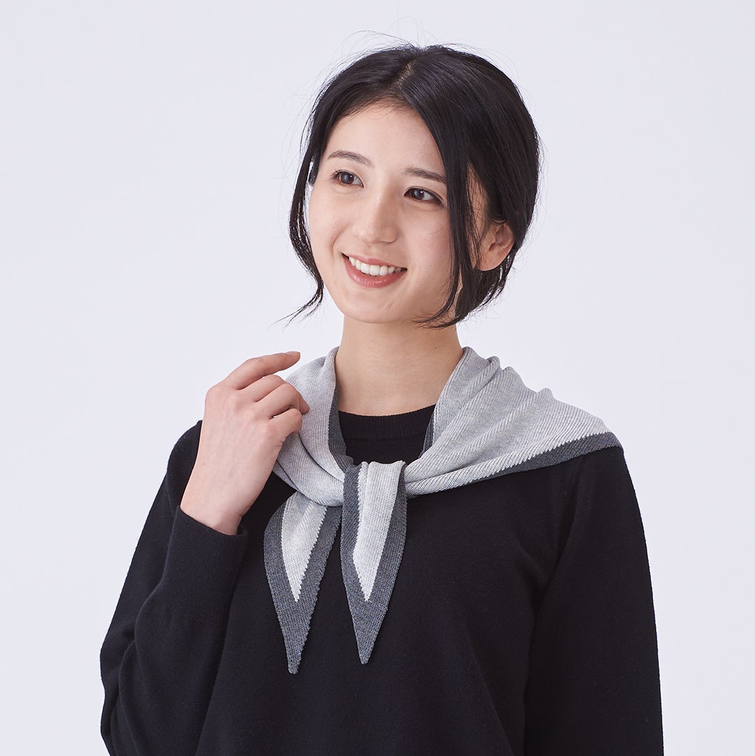 首元がシンプルに華やぐ、肌触り滑らかなニットで編み立てた三角スカーフ。クーラーや季節の変わり目の首元からの冷え対策におすすめです。抗菌防臭加工を施しているため、気になるにおいを発生しにくく安心してお使いいただけます。