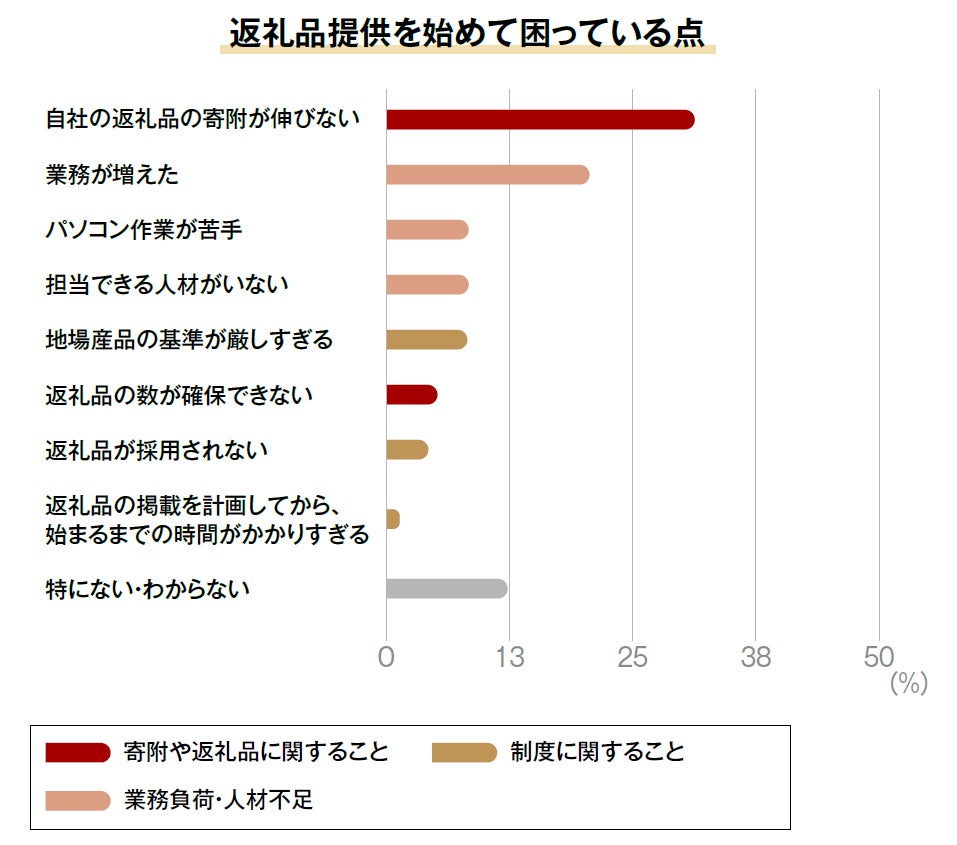次に多かったのが「リピーター(顧客)ができた」(20%)と「ふるさと納税をきっかけに自社の他の商品(サービス)を利用する人が増えた」(17%)で、ふるさと納税に参入したことで寄附以外の副次的な効果が生まれたことがメリットと感じているようです。