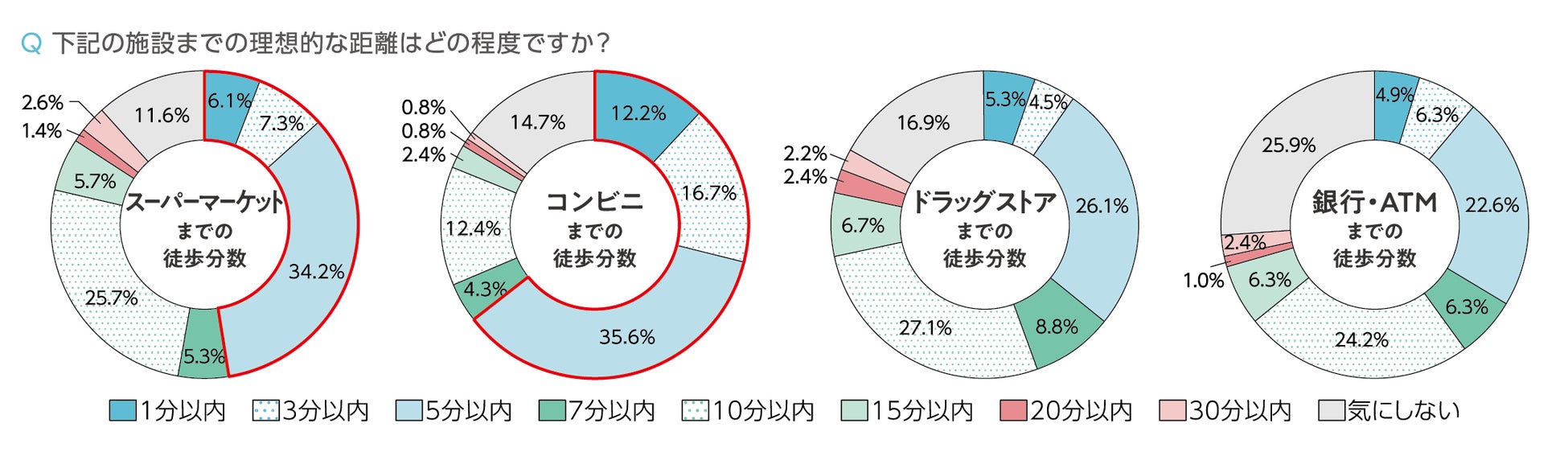周辺環境については、64.5%がコンビニまで「徒歩5分以内」が理想的と回答しました。また、スーパーマーケットについては「5分以内」が理想的と回答したのは47.6%で、家事をするにあたりこれらの施設に近いことが求められているようです。