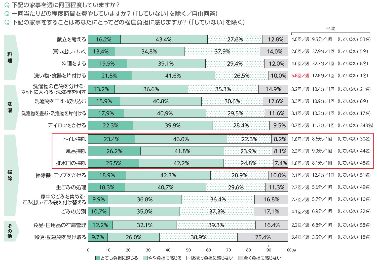 さまざまな家事の中で、「トイレ掃除」が最も負担に感じる人が多く、「とても負担に感じる」「やや負担に感じる」を合わせて69.4%でした。さらに「風呂掃除」「排水口の掃除」と続き、水回りの掃除に対して負担を感じている人が多いようです。また、頻度が最も高いのは「洗い物・食器を片付ける」で、平均して週に5.8回でした。