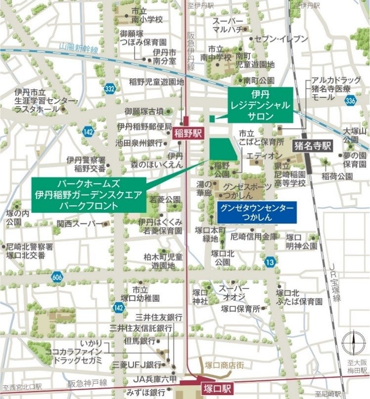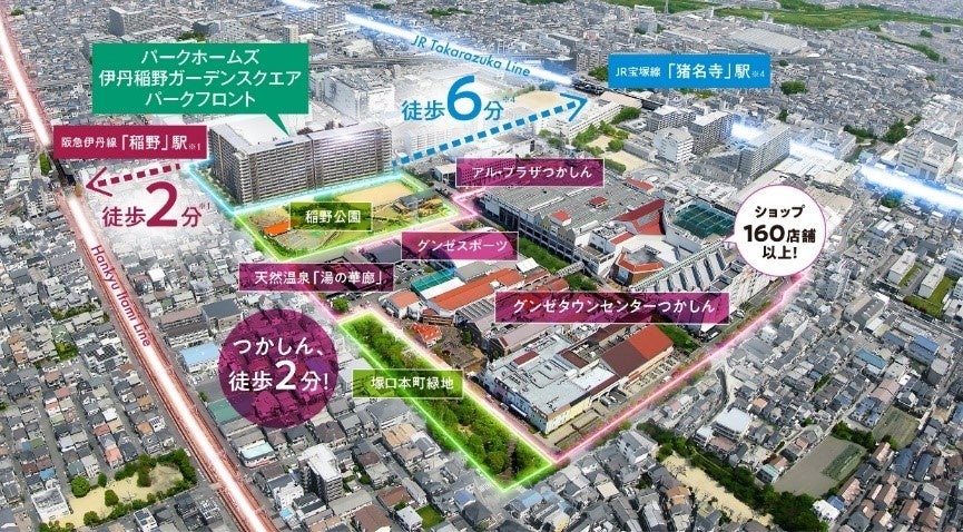 本物件は、阪急電鉄伊丹線「稲野」駅から徒歩2分、JR宝塚線「猪名寺」駅から徒歩6分。 大型商業施設「グンゼタウンセンターつかしん」に近接し、地域のオアシス「稲野公園」に隣接する地に、敷地面積16,000m²超、総戸数571戸、全5棟の壮大なスケールで創造する大規模分譲マンションです。