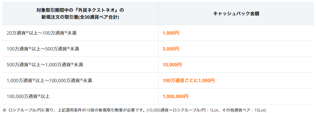 ◆特典① :期間中に『外貨ネクストネオ』にて1万通貨※以上の新規注文のお取引を1回で2,000円キャッシュバック
