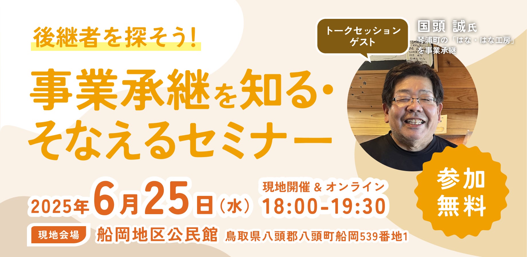 事業承継をお考えの皆様をはじめ、事業承継によって創業を考えている方や事業承継支援機関の方など、たくさんのご参加をお待ちしております!