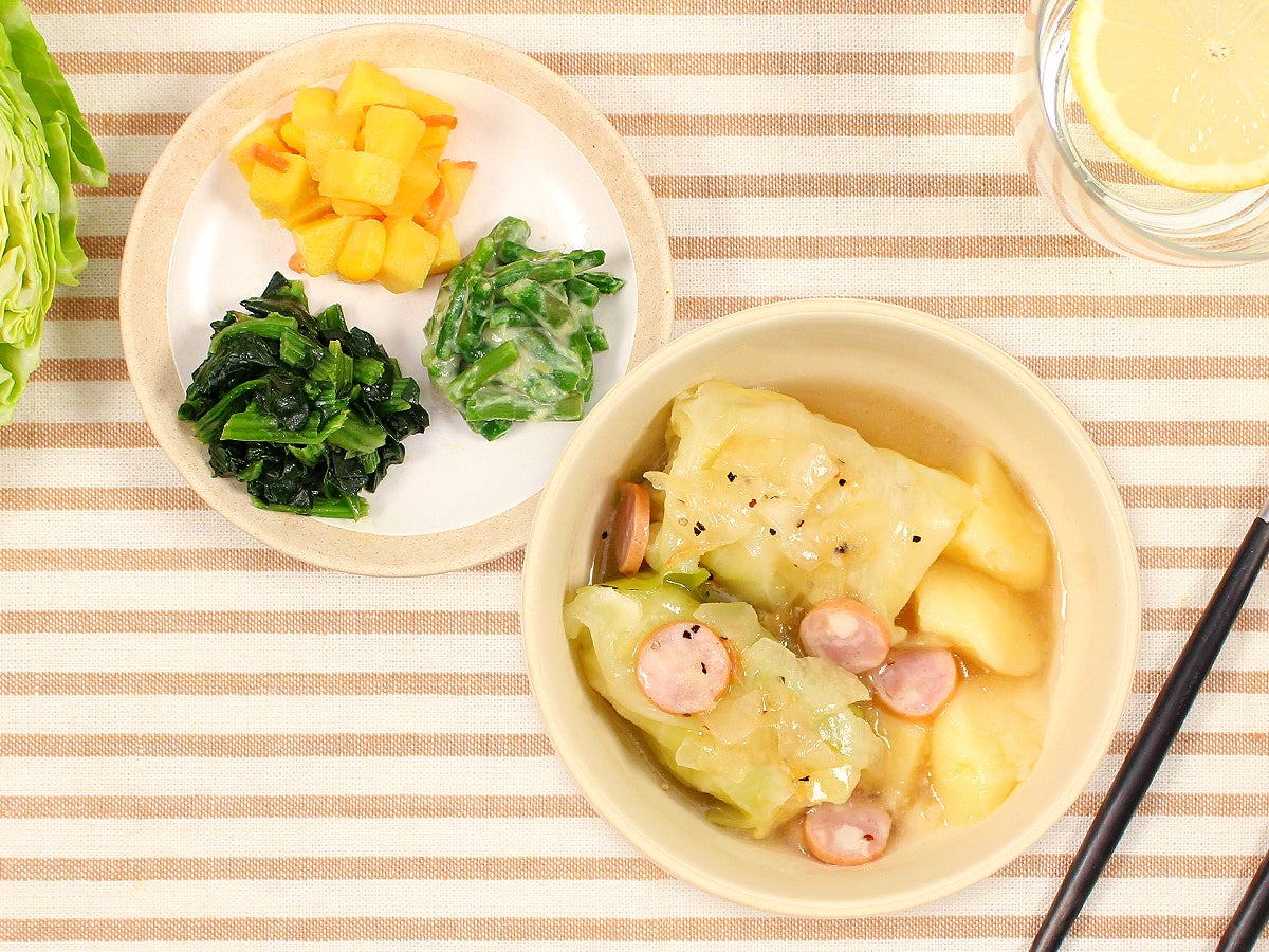 シェフと商品企画担当者こだわりの一品が登場!大きなロールキャベツにはお肉がたっぷり詰まっており食べ応え抜群です。隠し味としてコンソメソースに貝の旨みを加えることで、より味わい深く仕上げております。ウィンナーやほくほくのじゃがいもも一緒にお楽しみください。