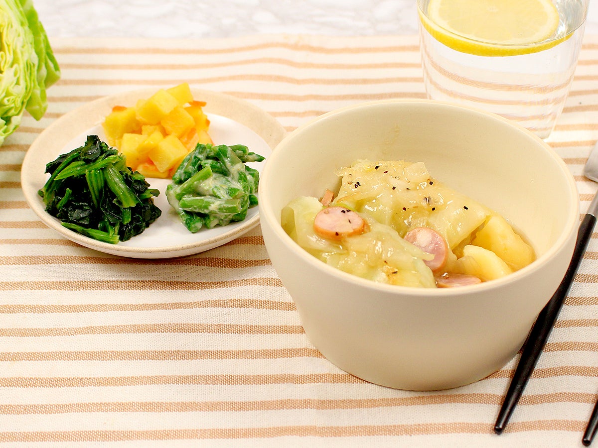 副菜は、鶏ガラ風味のほうれん草のソテー、マヨネーズで和えたさつまいもコーン、アスパラチーズです。