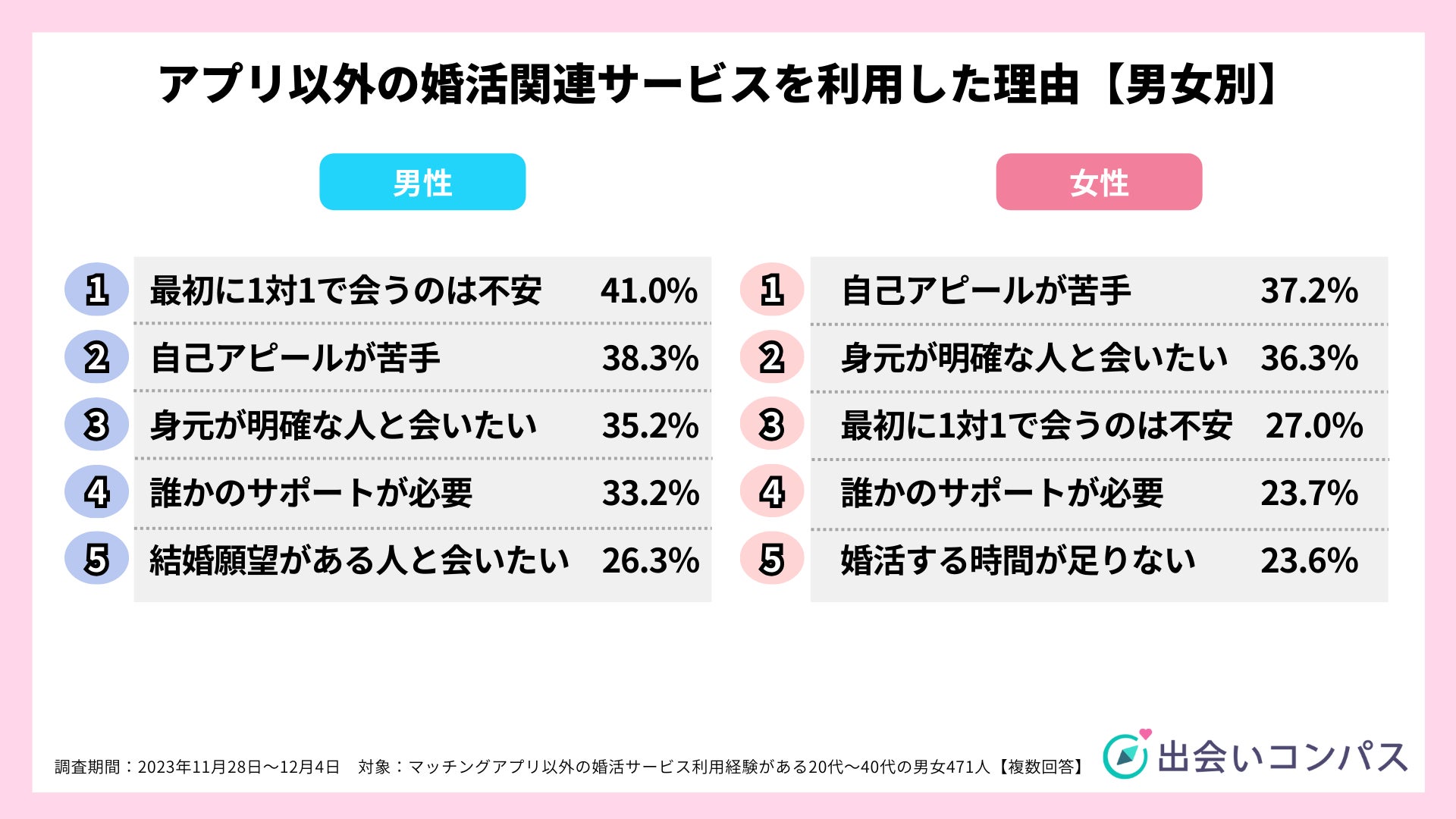 マッチングアプリと婚活サービスを併用する理由1位は「自己アピールが苦手だから」