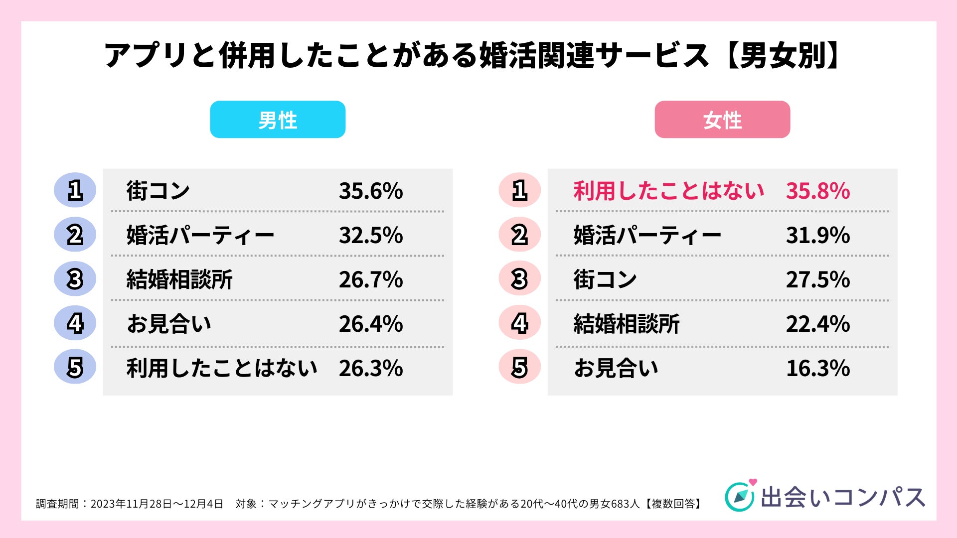 続いてこの結果を男女別で見ると、アプリと並行して利用した婚活サービスを「利用したことはない」と回答した割合は女性の方が多く、そのほかの項目は全て男性の方が利用経験者が多い結果となりました。