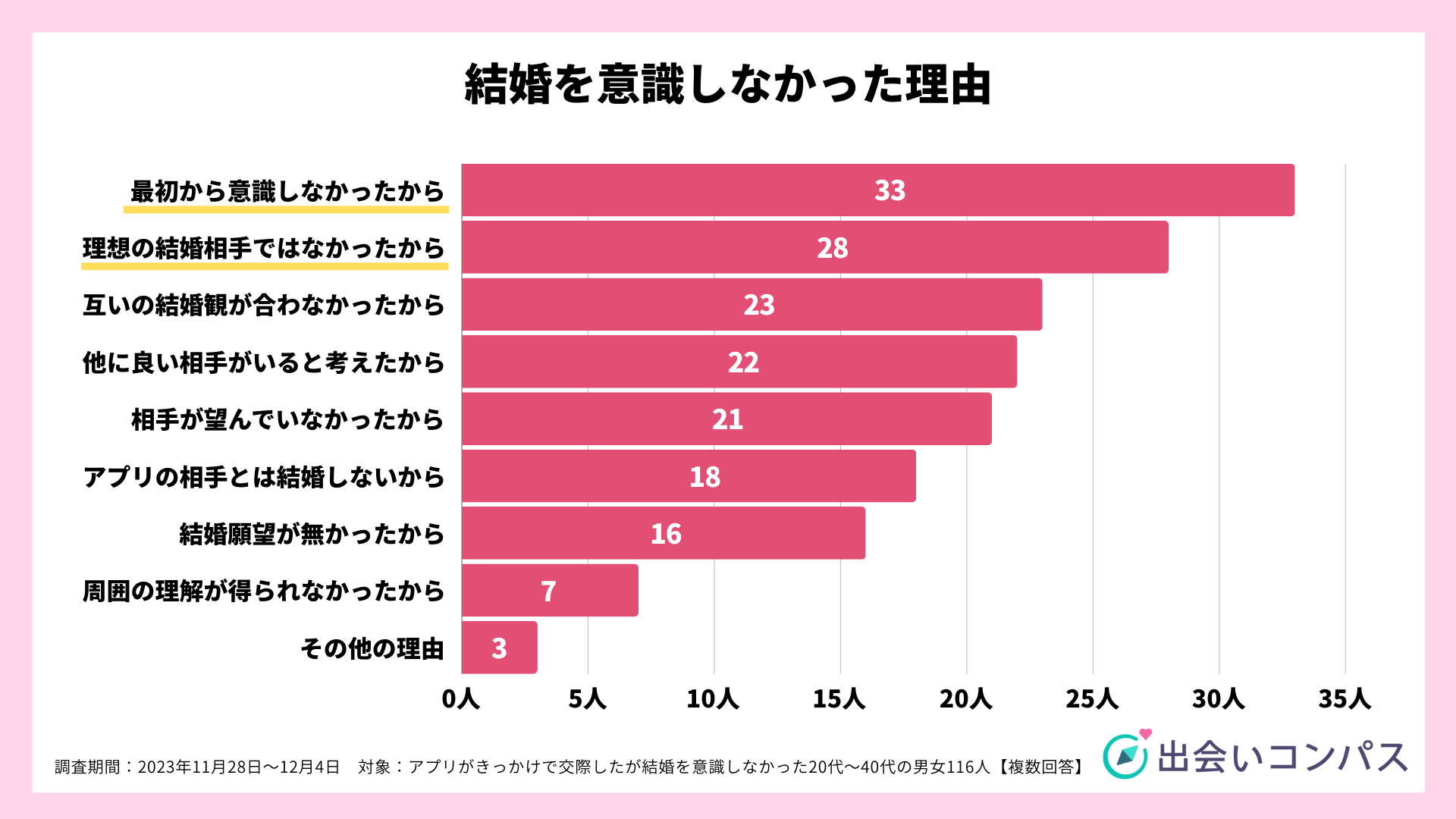 相手との結婚を意識しなかった人の理由については、「最初から意識しなかったから(33人)」が最も多く、次いで「理想の結婚相手ではなかったから(28人)」、「互いの結婚観が合わなかったから(23人)」でした。