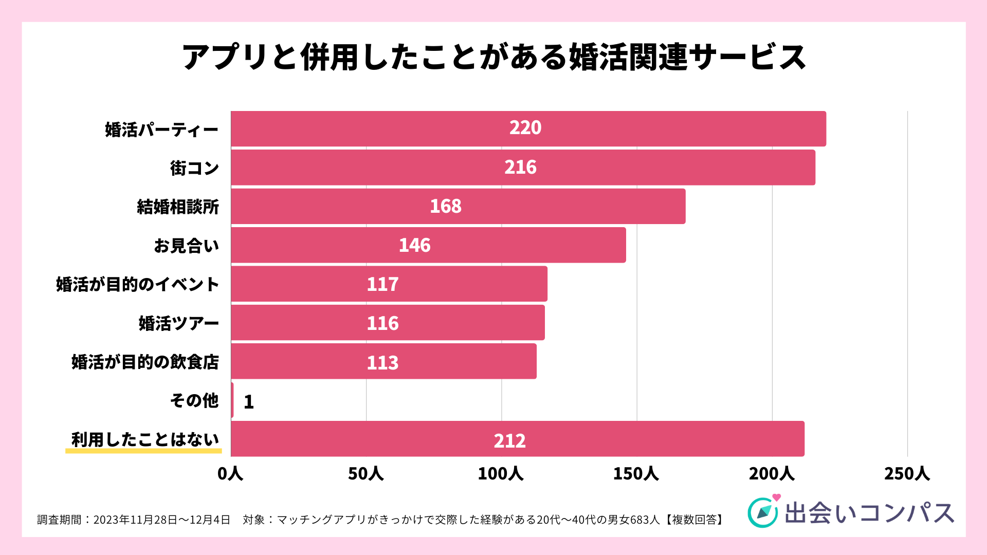 マッチングアプリと並行して利用したことがある婚活サービスを調査した結果、1位「婚活パーティー(220人)」、2位「街コン(216人)」、3位「結婚相談所(168人)」でした。