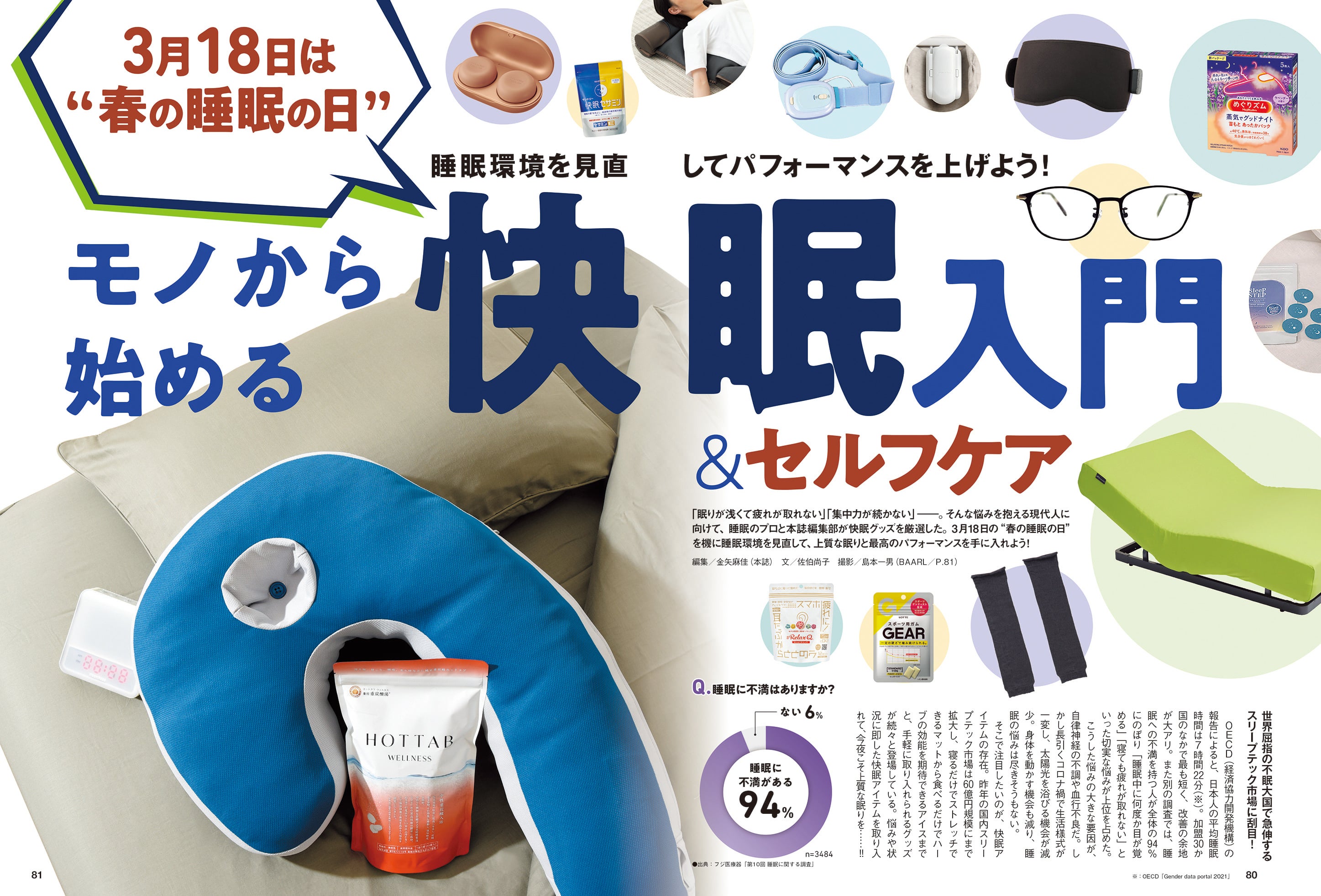 3月18日は「春の睡眠の日」。これを機に、眠りの環境をととのえて日々のパフォーマンスを上げよう! ということで最新快眠グッズをバリエーション豊かに紹介。「睡眠中に何度か目が覚める」「寝ても疲れが取れない」といった切実なお悩みに対して、プロが的確にお応えします。