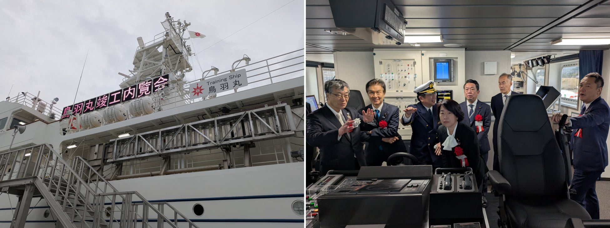 金城泰邦政務官からは「鳥羽丸は、練習船として初めて自律運航システムが搭載され、仮想岸壁への自動操船で離着岸できる機能、緊急時に周囲の安全を確認し、自動停船する機能を有しています。この鳥羽丸を最大限に有効活用し、これまで以上に高度な船員教育に取り組んでいただき、海洋人材の輩出はもちろん、地域社会に貢献することを強く期待しています」と祝辞が述べられました。