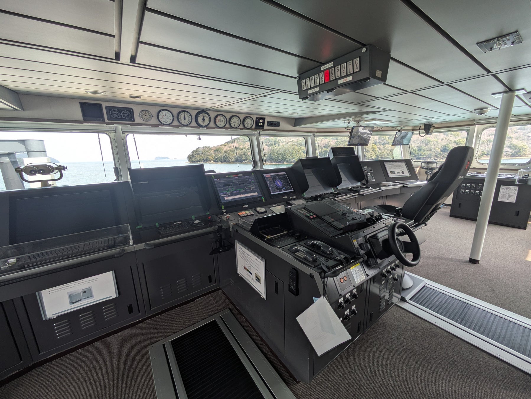 一方、本練習船は航海実習を行う海域(伊勢湾・三河湾・太平洋沿岸)での運用を想定したことから、情報統合型コンソールを備えた全閉囲型操舵室を採用しました。航海実習時等の立位、調査研究航海時等の着座を可能としており、コックピットのような操舵室になっています。また、船体の揺れを抑えるため、船首形状を工夫し、減揺タンク装置を設置しました。これにより横揺れを約40%抑制することができます。