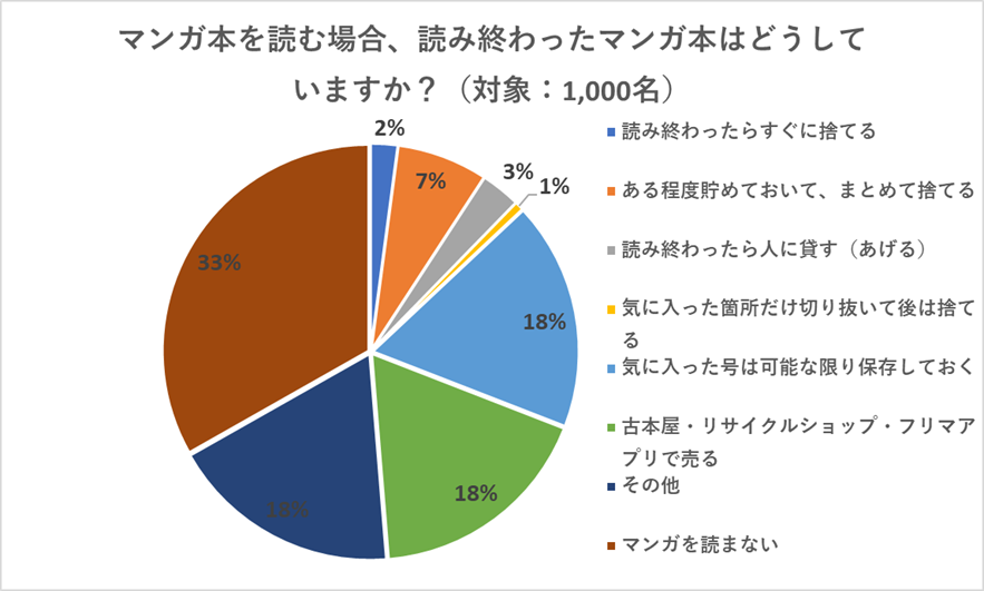 読み終わったマンガ本については、「気に入った号は可能な限り保存しておく」という回答が18%、「古本屋・リサイクルショップ・フリマアプリで売る」という回答が18%と同率でした。保存しておく人と売る人に分かれるようです。