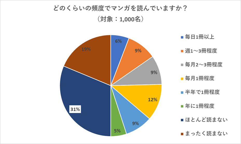 マンガを読む頻度については「毎月1冊程度」が12%、「半年で1冊程度」「週1~3冊程度」がそれぞれ9%、毎日1冊以上が6%となっており、傾向はバラけていました。