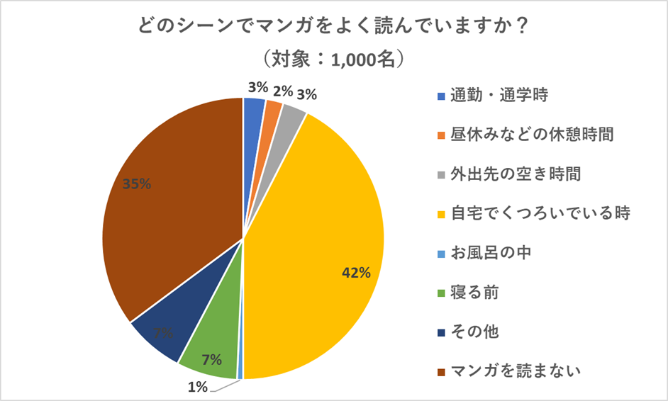 マンガを読むシーンについては、「自宅でくつろいでいる時」という回答が42%となっており、4割強の人が、マンガを自宅での自由な時間に読んでいることが分かりました。