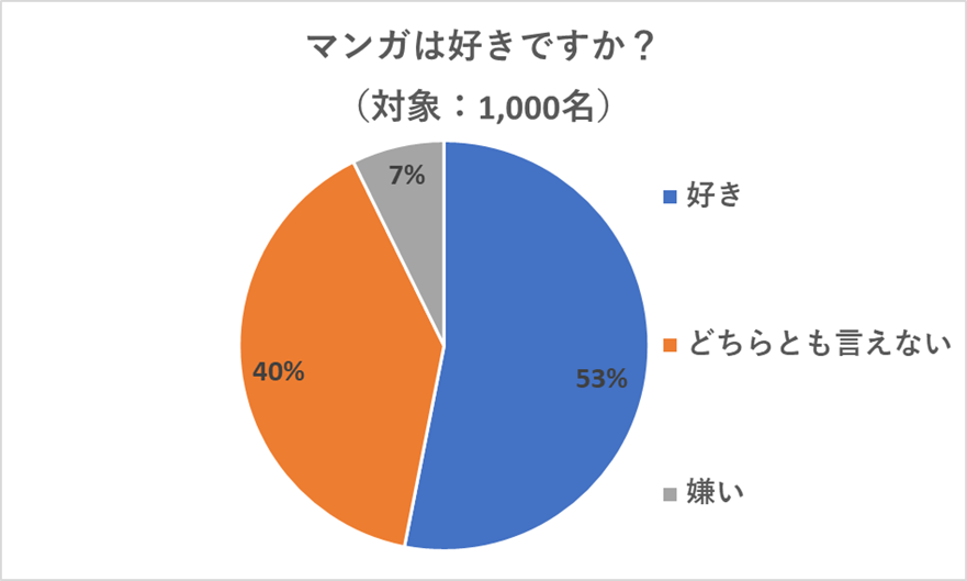 マンガは「好き」と回答した人が53%、次いで「どちらとも言えない」と回答した人が40%となっており、約半数の人がマンガを好きなことが分かりました。