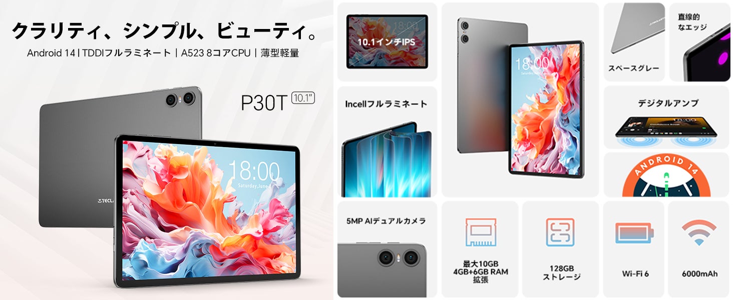 Teclast「P30T」の10.1インチの大画面を備え、重さ450g、ベゼル8mmの耐久性に優れたメタルボディを設計されました。高速なLPDDR4X RAM 4GBを誇り、6GBまでの仮想メモリ拡張を提供し、合計10GBのRAMを実現します。最大1TBのMicro SDカード容量拡張もサポートします。6000mAhの大容量リチウムバッテリと低消費電力プロセッサにより、最長7時間の動画視聴が可能です。
